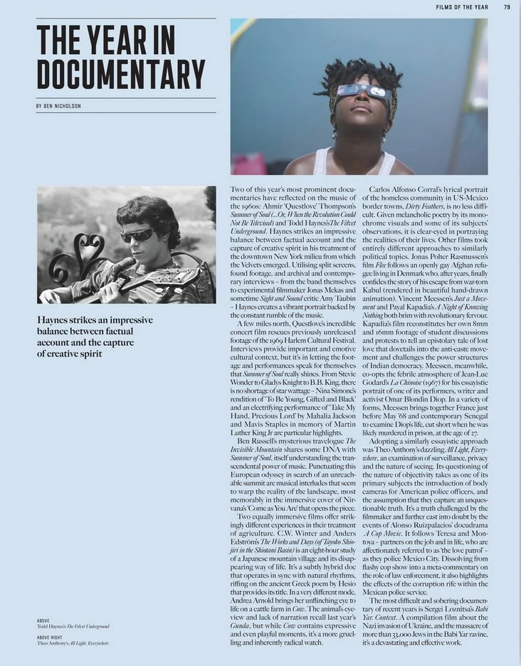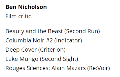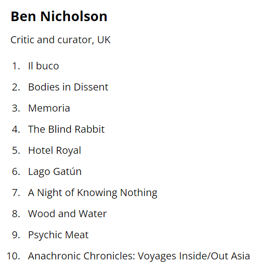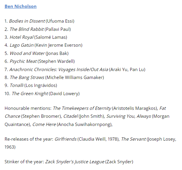 2021 in review 23 Dec Written By Ben Nicholson A brief visual round-up of my various contributions to ‘Best of 2021’ features/polls/lists etc. My round-up of the year in documentary film for the Sight and Sound review of 2021 My picks for the Sight and Sound review of the best DVDs and Blu-rays of the year My ballot for the Sight and Sound 50 best films of 2021 list My votes in The Skinny’s Films of 2021 poll Ben Nicholson